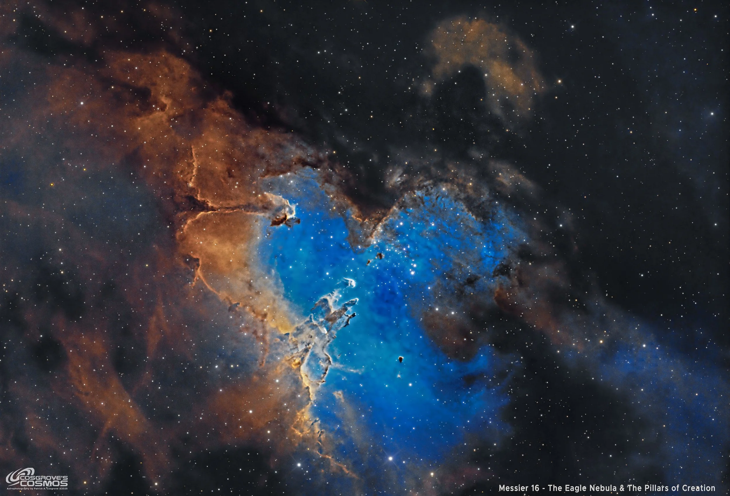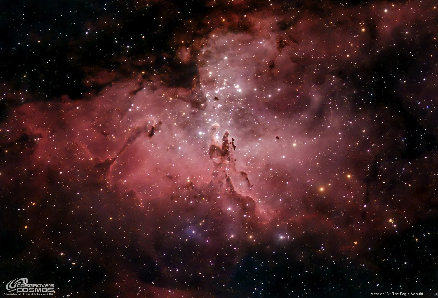 Messier 16—better known as the Eagle Nebula—is located some 6,500 light-years away in the northern reaches of the constellation Serpens Cauda. What the eye sees as a modest sixth-magnitude patch is actually a large H II region, its hydrogen set aglow by the ultraviolet output of the young open cluster NGC 6611 at its heart. Among the sculpted ridges and voids rise the famous “Pillars of Creation,” three dust columns roughly four to five light-years long that silhouette against the cavity they helped carve.