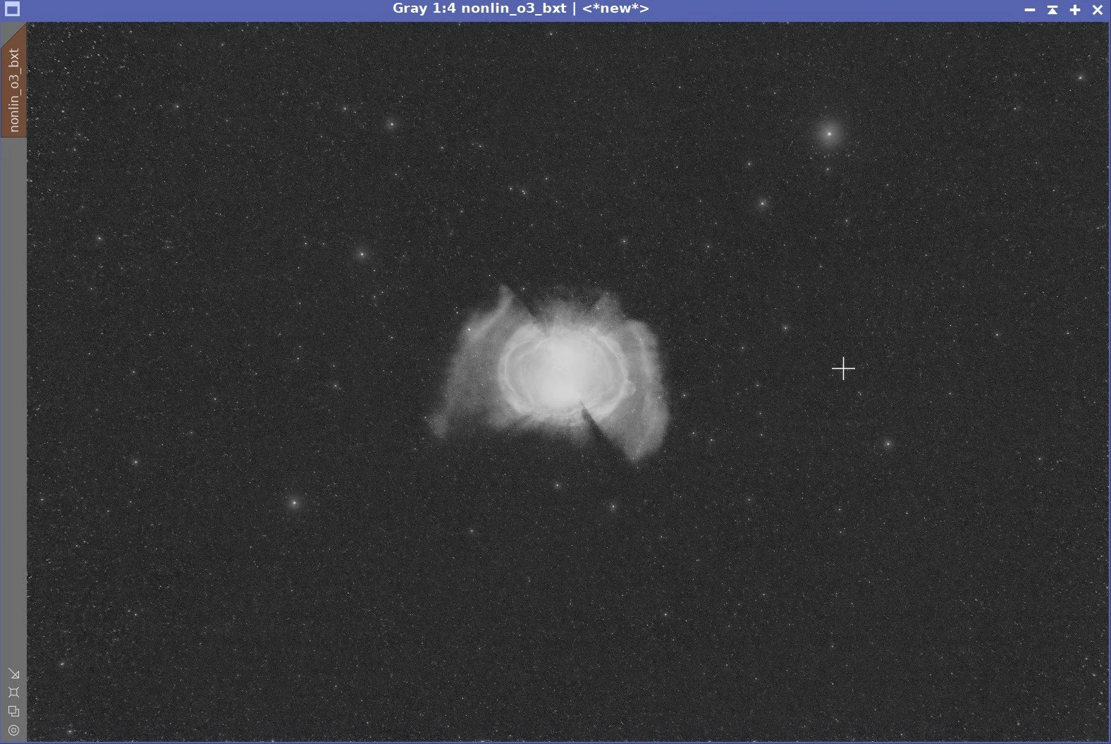 We will create a synthetic luminance image that focuses on preserving the delicate details in the outer shroud, as seen in both the Ha and O3 image. We will do a 50-50 bend of the two images to do this. Then we will process that image to show the best detail.