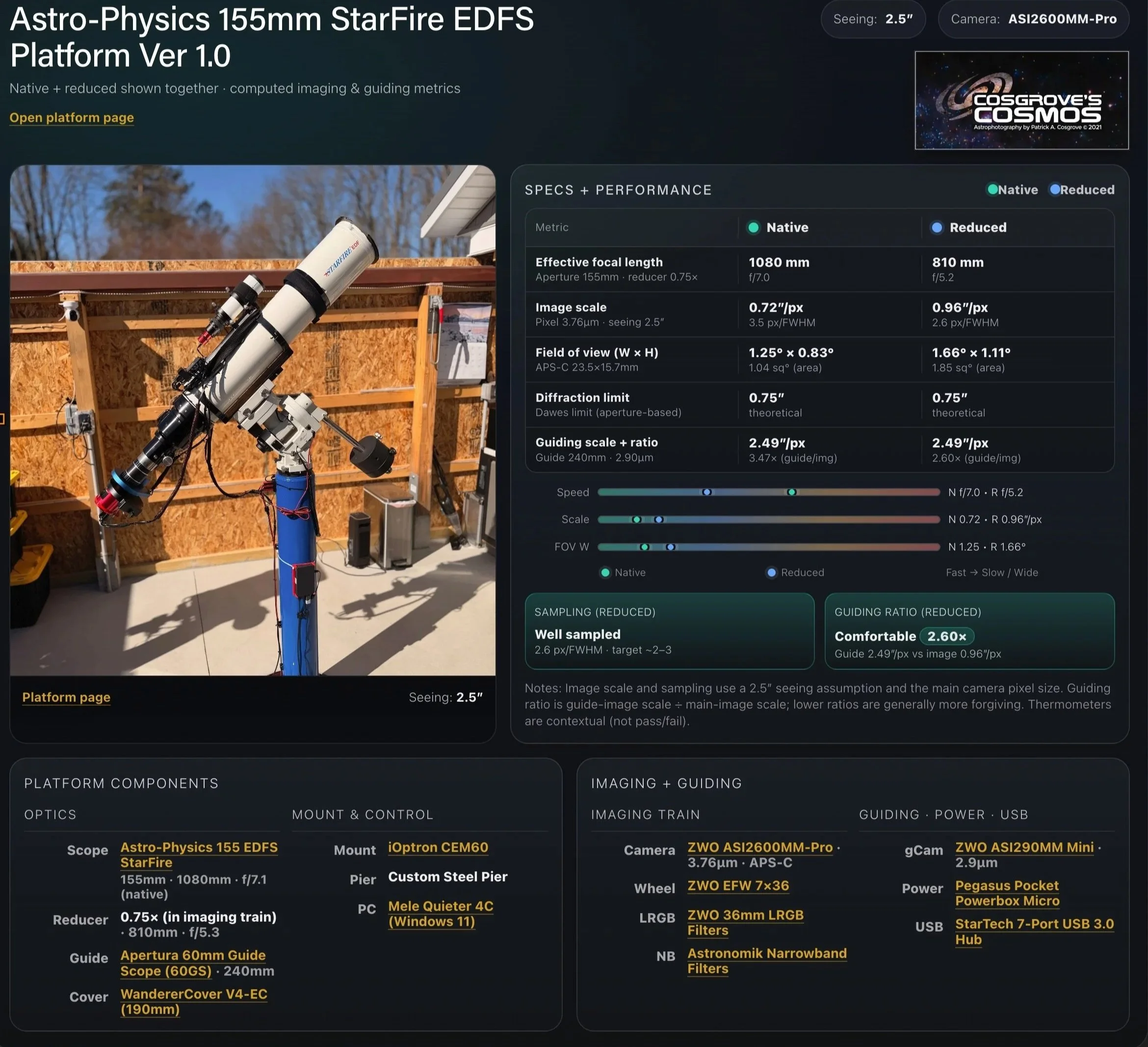 The AP155 f/5.3 Platform, with an iOptron CEM 60 mount, and a ZWO ASI2600MM-Pro camera.