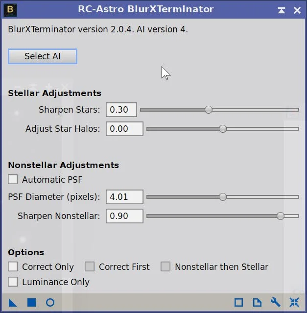 I am anticipating that I will do a tight crop around the main galaxy and Deer Lick group - with this “magnification,” I am concerned that the star image sizes will look bad. Although I did not use a starless workflow, I will still use the ReduceStars Script to adjust things. That will need a starless image, so create one with SXT.