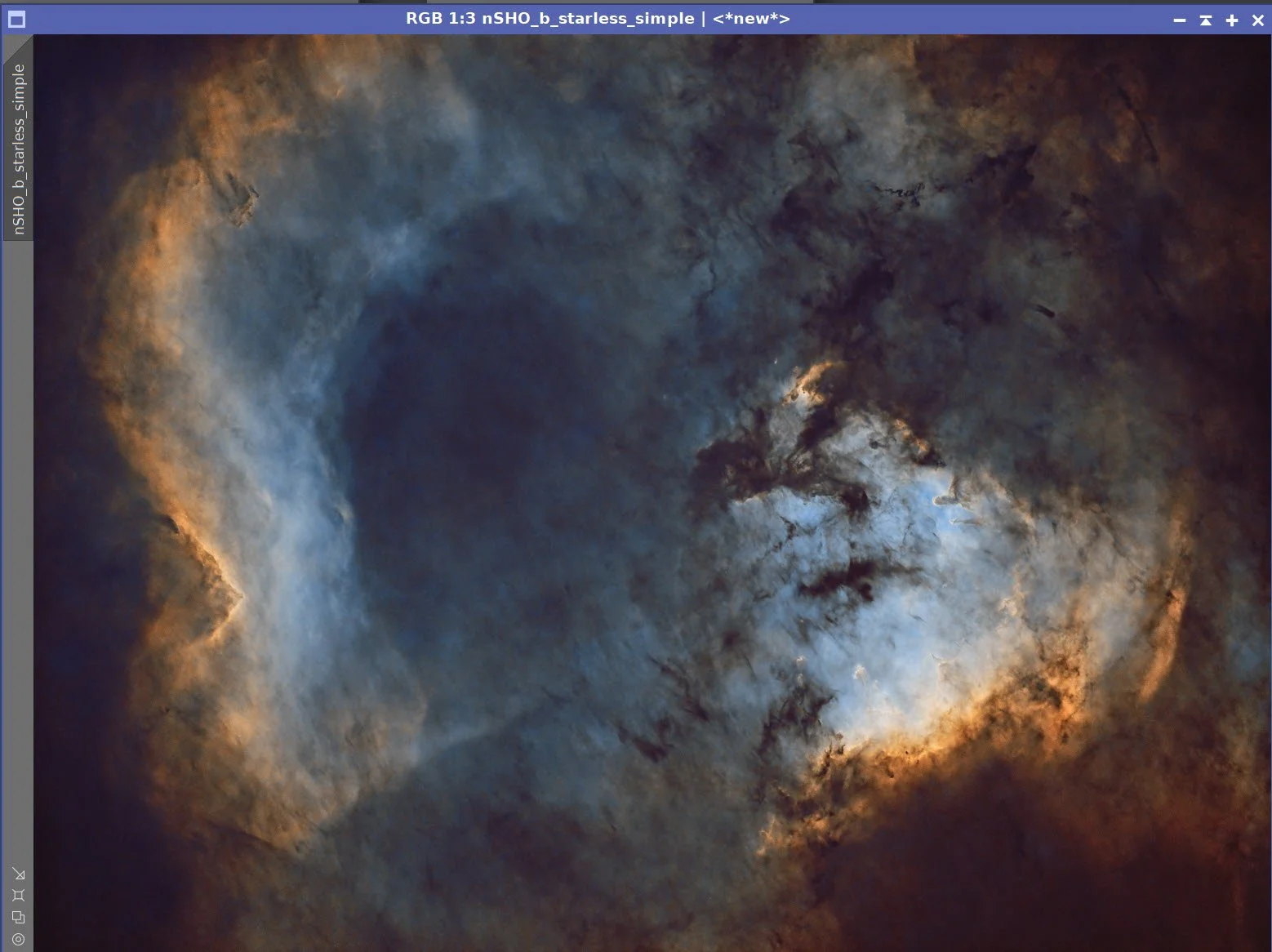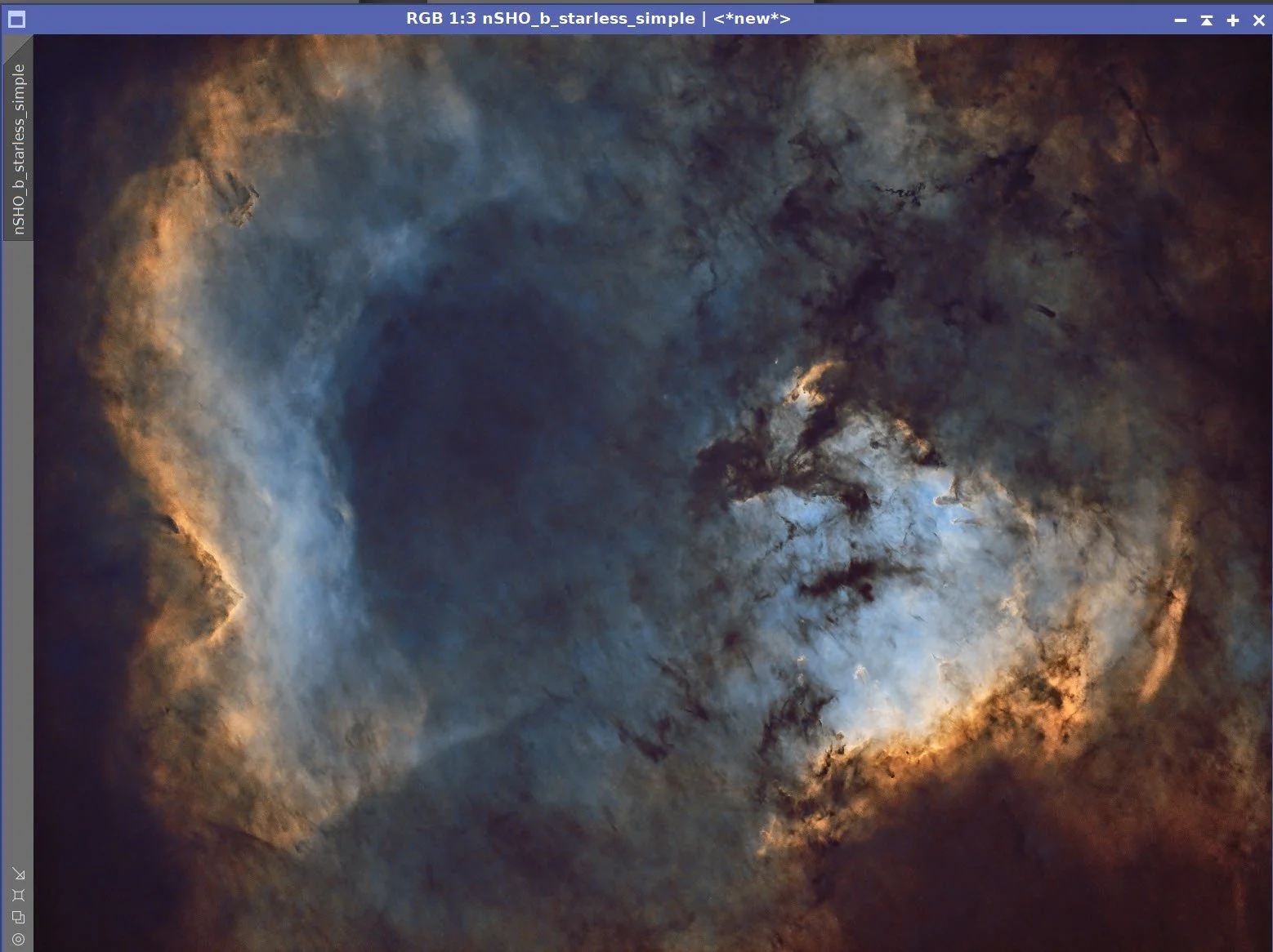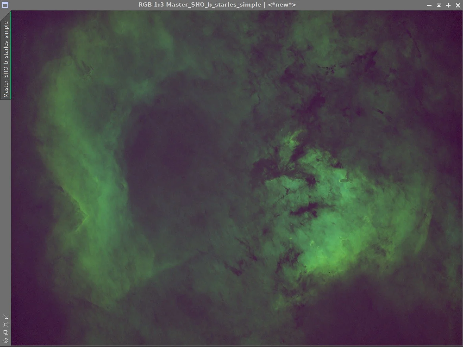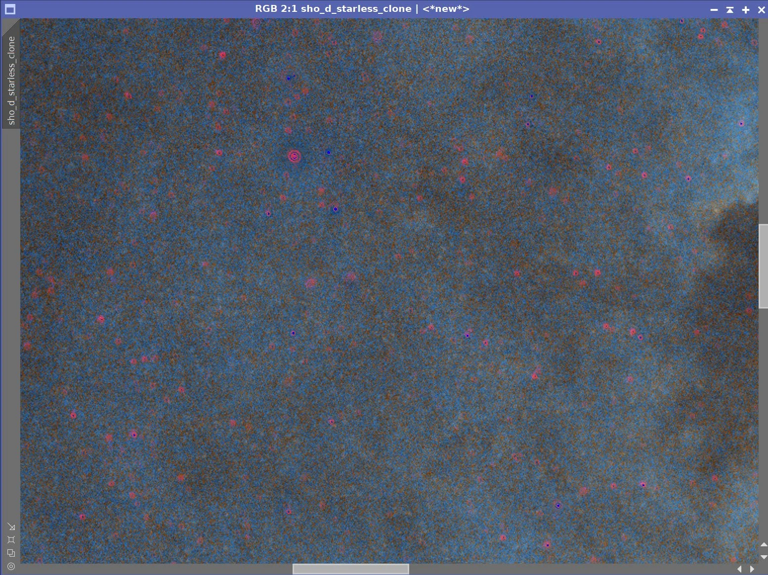The trick, in this case, seems to be to go starless before we create the first color SHO image. Since I am replacing the stars with RGB stars, why deal with weird color SHO stars at all?