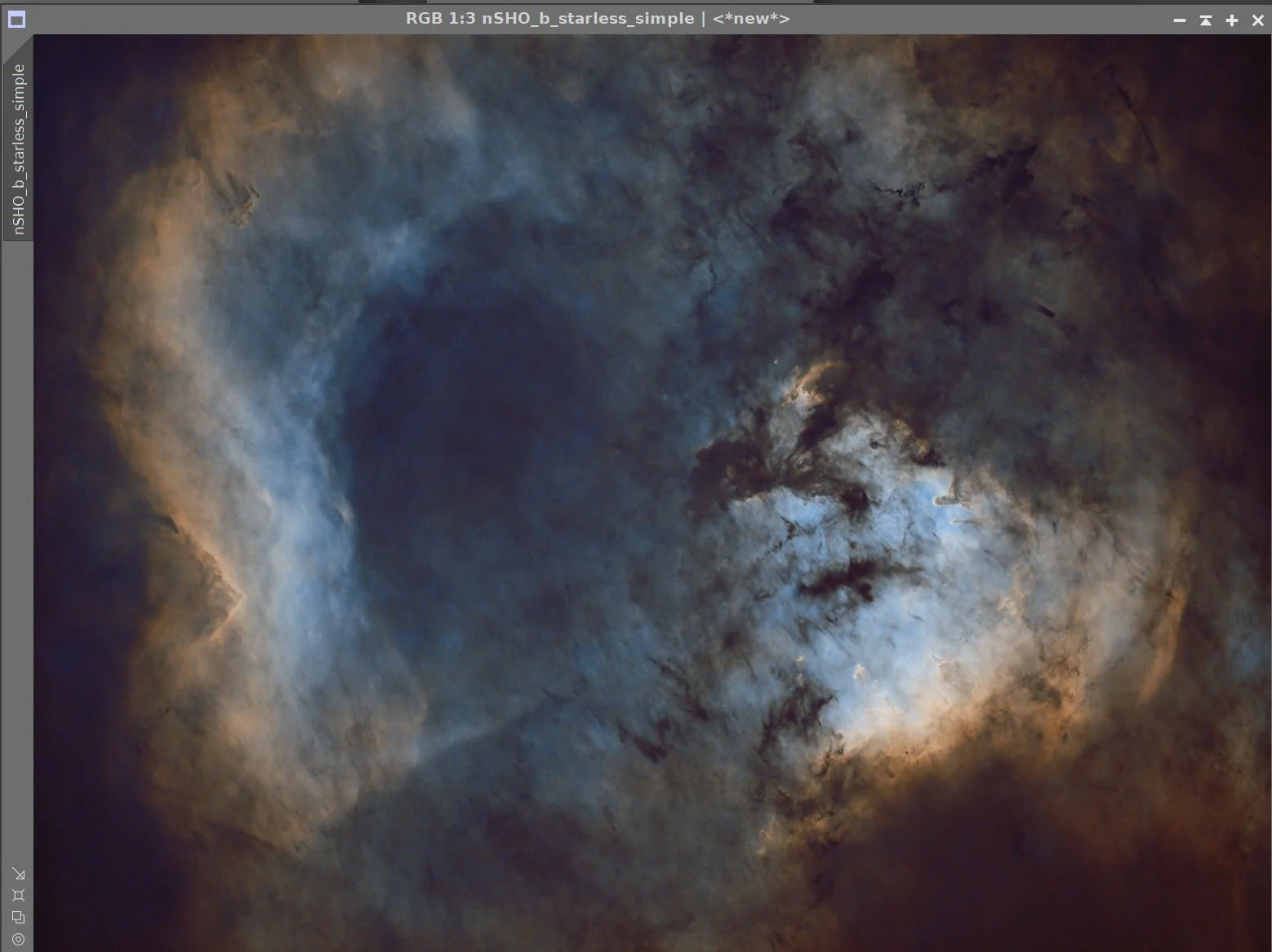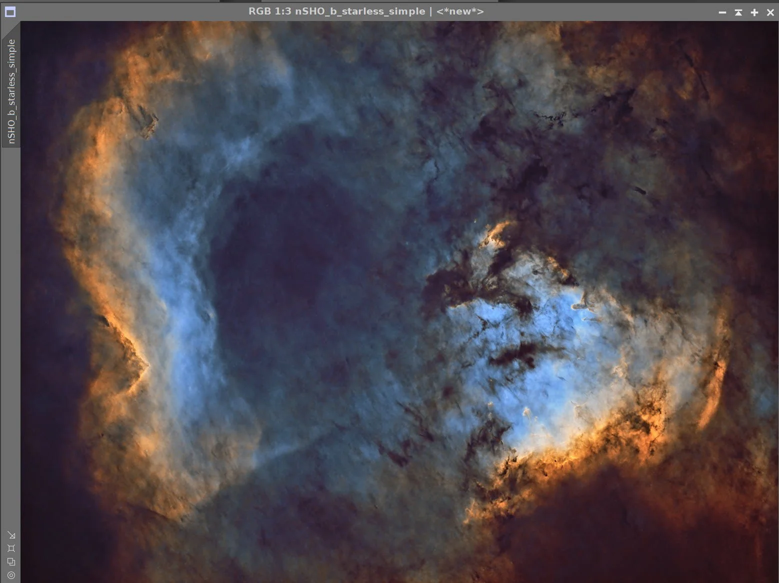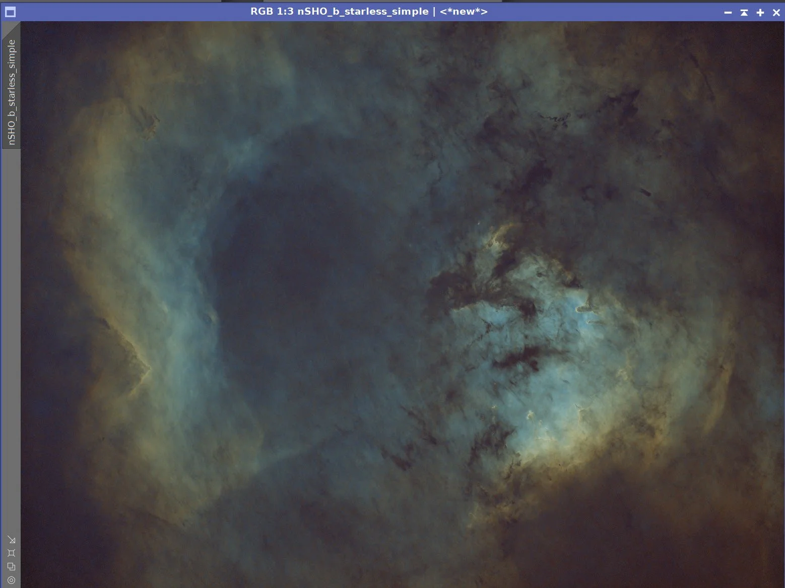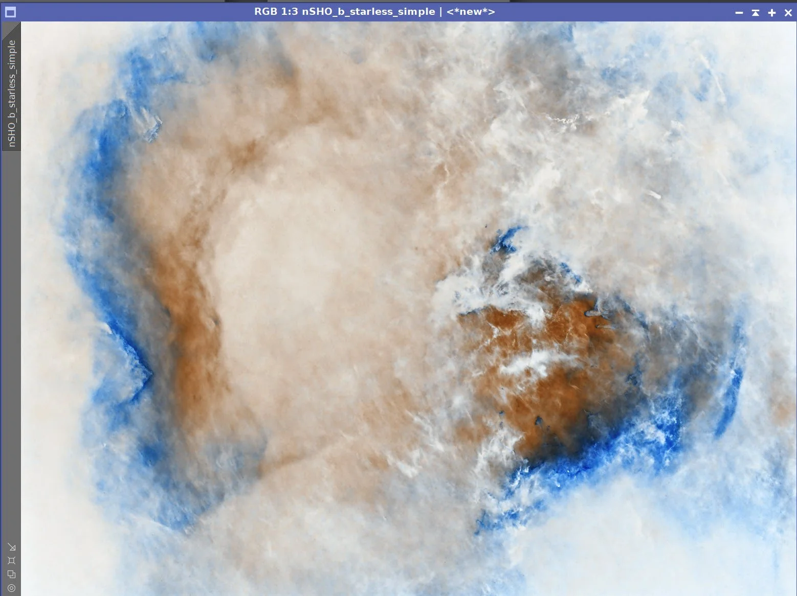 The trick, in this case, seems to be to go starless before we create the first color SHO image. Since I am replacing the stars with RGB stars, why deal with weird color SHO stars at all?