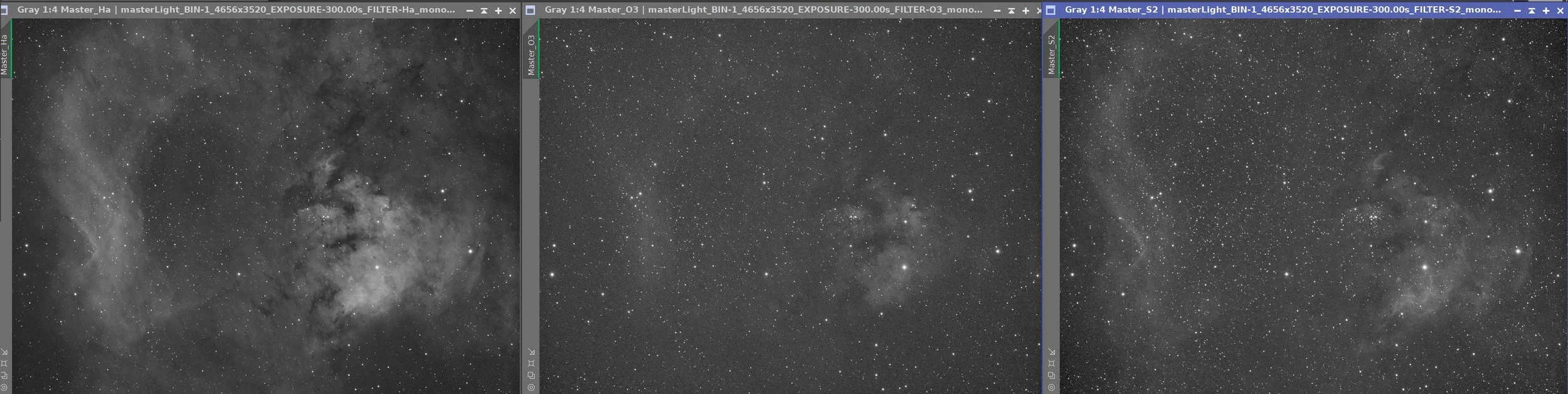 The linear Narrowband images are now starless after STX: Ha, O3, S2