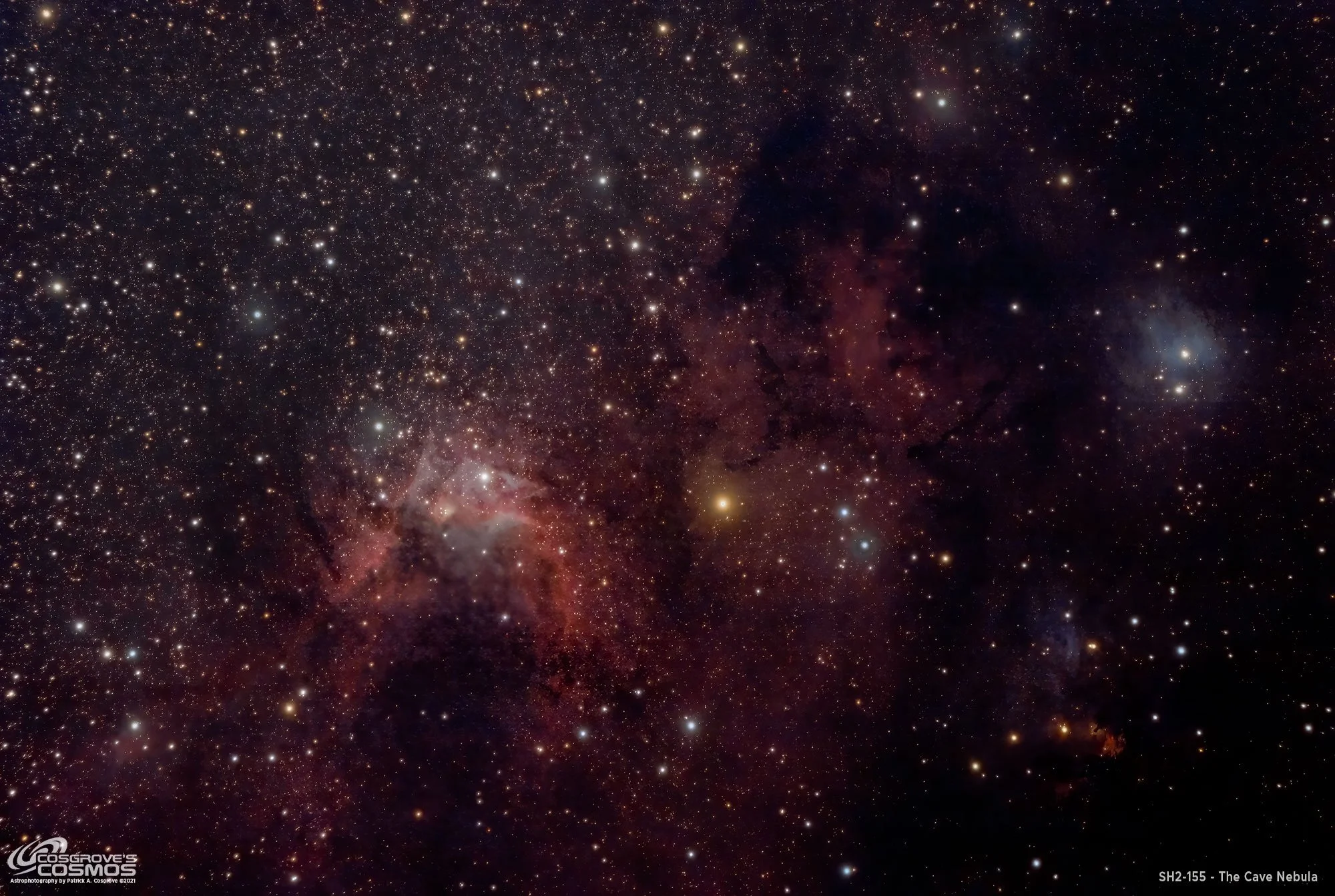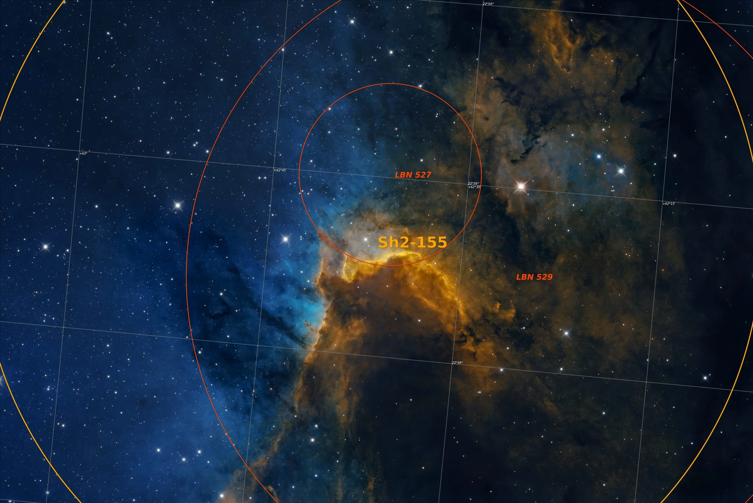 The object is most commonly listed as Sharpless 2-155 (Sh2-155). In amateur observing, it is also Caldwell 9 in Patrick Moore’s Caldwell catalogue, and in the Lynds Bright Nebulae, it appears as LBN 529. The popular name “Cave Nebula” became widespread through the Caldwell listing and the nebula’s appearance.