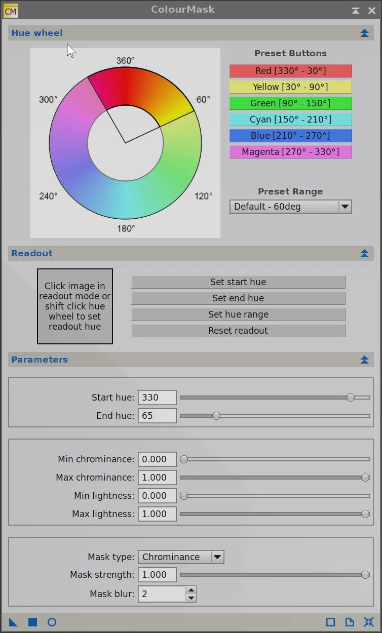 Create the WarmMask with the ColourMask Process with a hue range of 330 to 65 and a mask blur of 2.0.