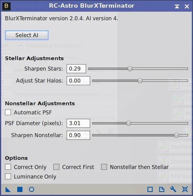 Apply BXT with full correction. See panel-snap for values used. These were selected after interactive testing. ( I find I get the best nonstellar results when the correction is about 1/3 larger than the measured star sizes)