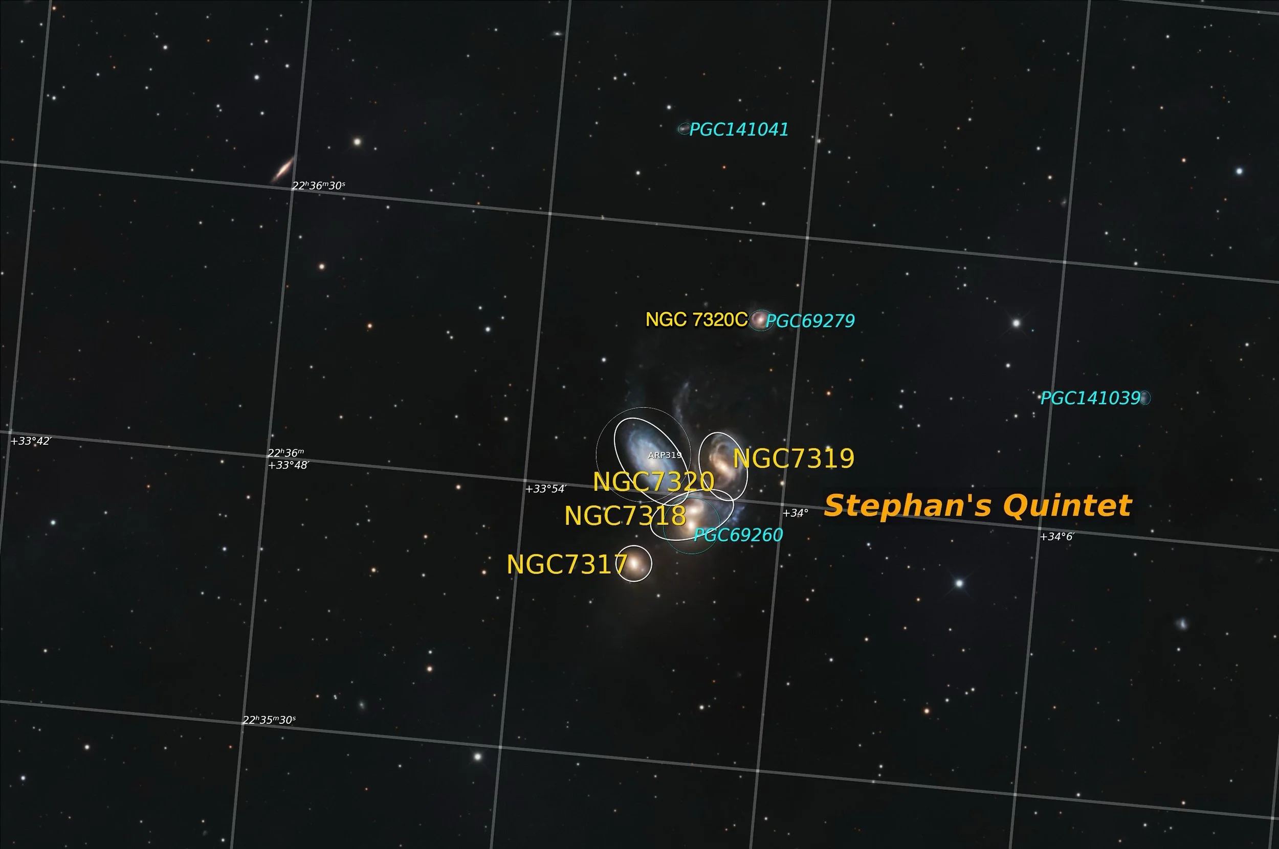 | NGC 7320C | Outlying intruder | 0.7 × 0.6 | 42″ × 36″ |