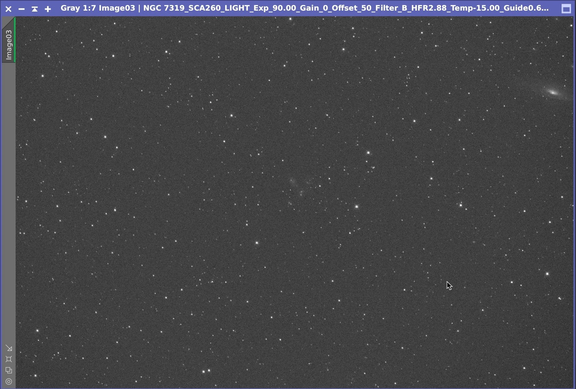 While this is faint, the exposure is better with the Lum filter as its wide spectral cut lets in more photons. The RGB color subframes only allow about 1/3 as wide as the Lum and these subframes show even less! Below is a single Blue subframe.