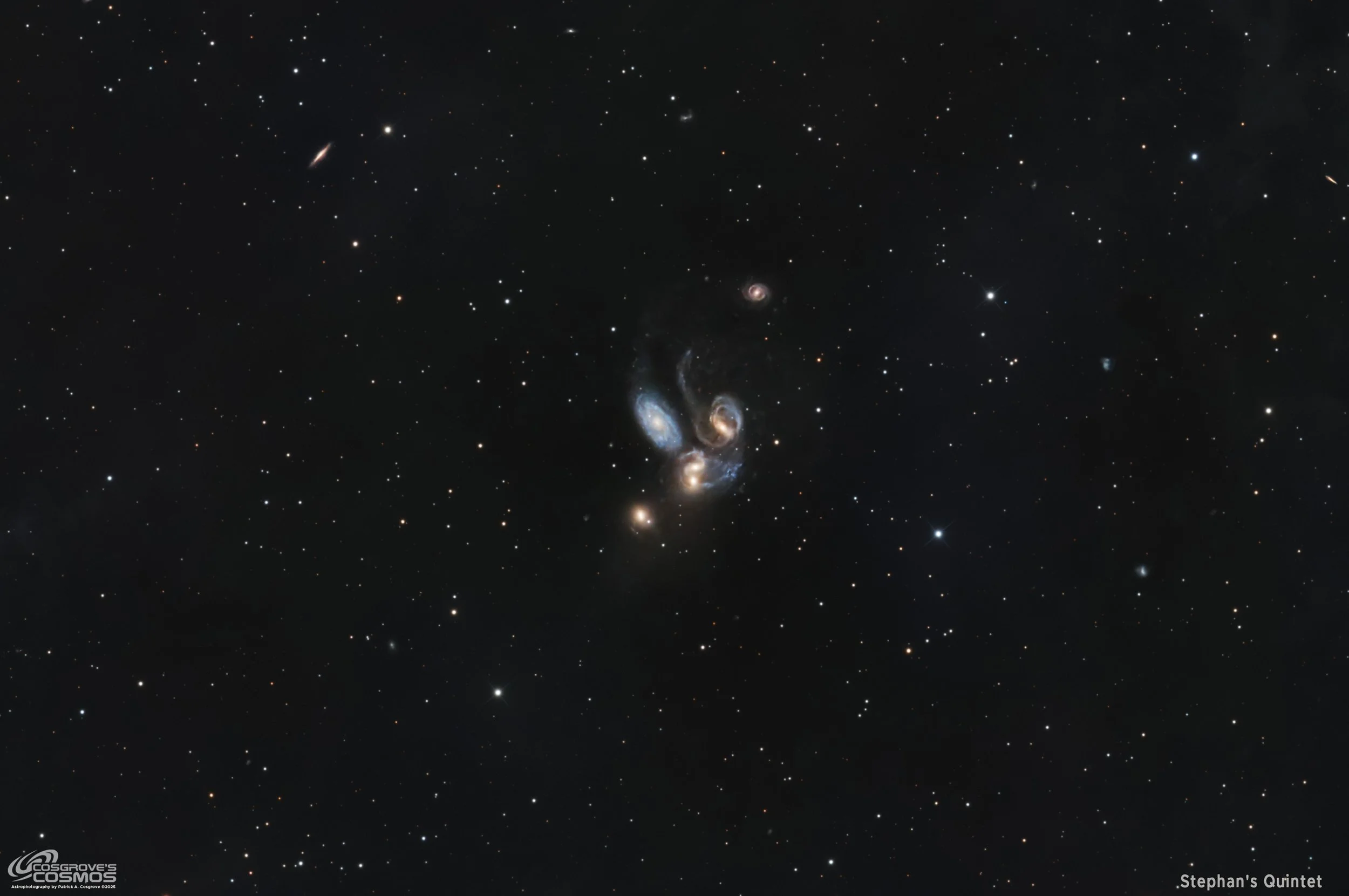 The four far members (NGC 7317, 7318A, 7318B, 7319, plus the intruder 7320C) are engaged in a slow-motion gravitational collision. As they tug and merge, they have warped each other’s shapes considerably.
