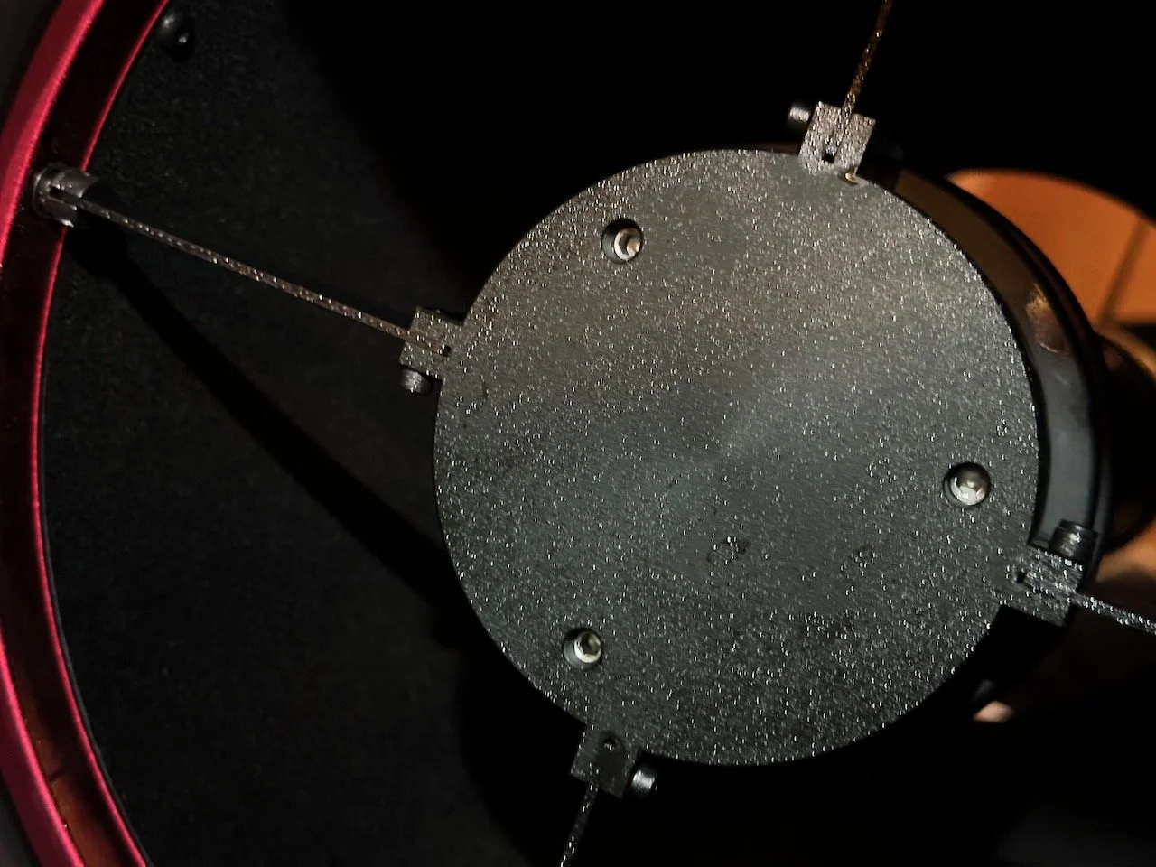 After the night of October 16th, I went out to shut down the observatory. When I looked at the SCA 260, I found a lot of dew forming on the front of the secondary holder. So what's the big deal? The scope was facing up, and the dew would drip back down on the primary mirror! Oh No!! AHHHH!